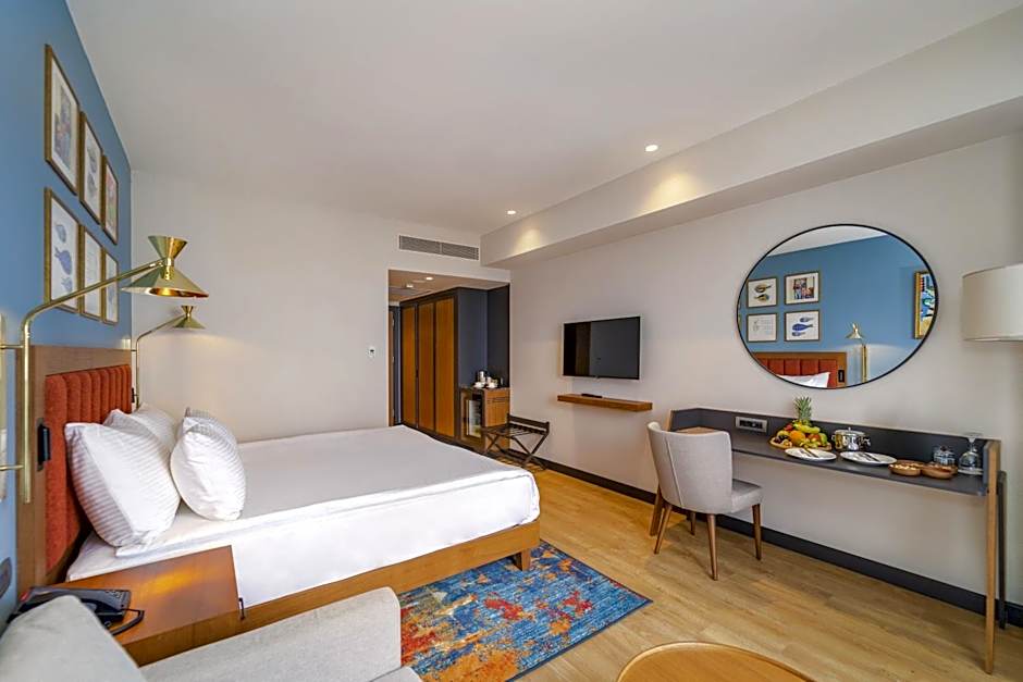 Deluxe Side Sea View is 269 square feet and includes a king-size bed 150-183 width plus a sofa bed plus balcony, desk, satellite tv , hairdryer, tea and coffee making facilities , safe, bathrobes, and slippers.